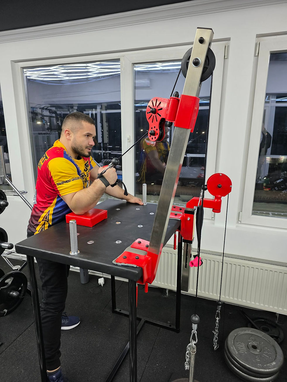 Prieteni, ce fel de dispozitiv este acesta? Acest dispozitiv simulează o masă. De asemenea, simulează o luptă unu la unu. Dacă vă uitați la mâner, unde ar trebui să vă țineți cu mâna, este înșurubat. Adică, este ca și cum ați apuca o mână adevărată și ați închide mâna. În plus, întindeți și apăsați în lateral. Adică, acest dispozitiv simulează o luptă reală. Puteți doar adăuga greutate acolo.